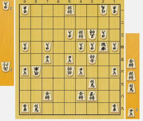 将棋ウォーズ3分 vs三段戦より 実戦は3四から精算する筋ばかり読んでいて、簡単な5手詰めがあることにきがつかなかった……。ちなみに3四からの生産はギリギリ詰まない。実戦は詰み筋に入ったが時間切れ。