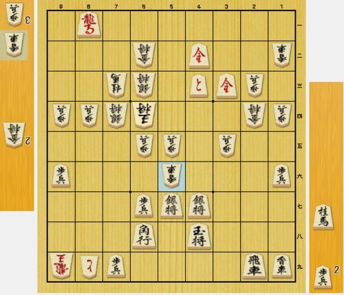 将棋ウォーズ 3分戦 vs三段より 実戦ではやや分が悪いと思っていた局面。よく見ると5手詰みがある。 実戦心理で盲点に入っていたが、詰みがある、と言われれば簡単だと思う